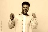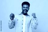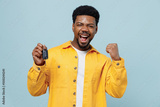 Young man of African American ethnicity 20s in yellow shirt hold car keys fob keyless system do winner gesture isolated on plain pastel light blue background studio portrait. People lifestyle concept.