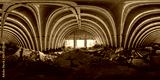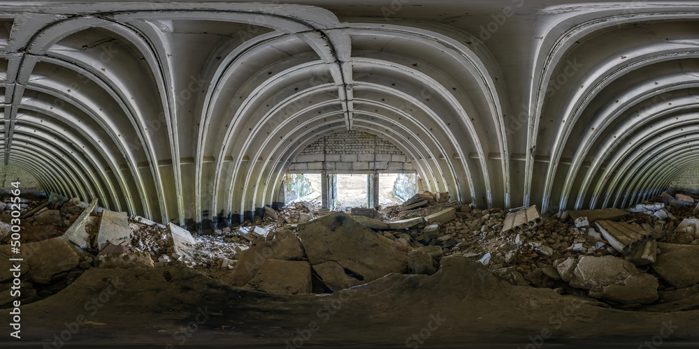 seamless spherical hdri 360 panorama view inside of empty old hangar with pieces of broken concrete and building materials in equirectangular projection, ready for AR VR virtual reality content