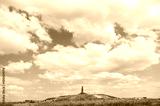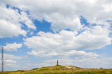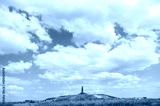 Sign of the mount Stoj peak under blue sky with clouds at Borzhava meadow, Carpathian mountains, Transcarpathia, Ukraine
