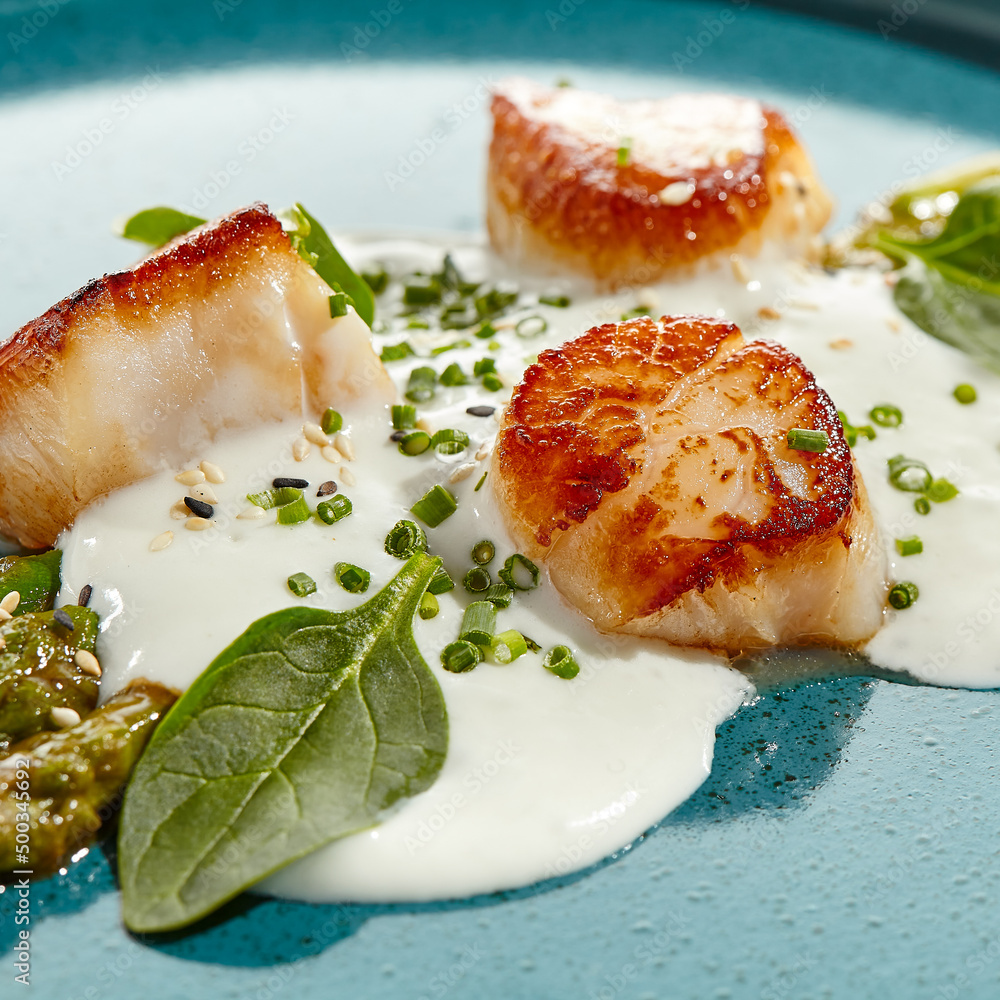 Luxury dish - grilled scallops with asparagus and creamy espuma. Roasted scallop with cream sauce and asparagus on white background. Delicacy seafood in restaurant menu - sea scallop.