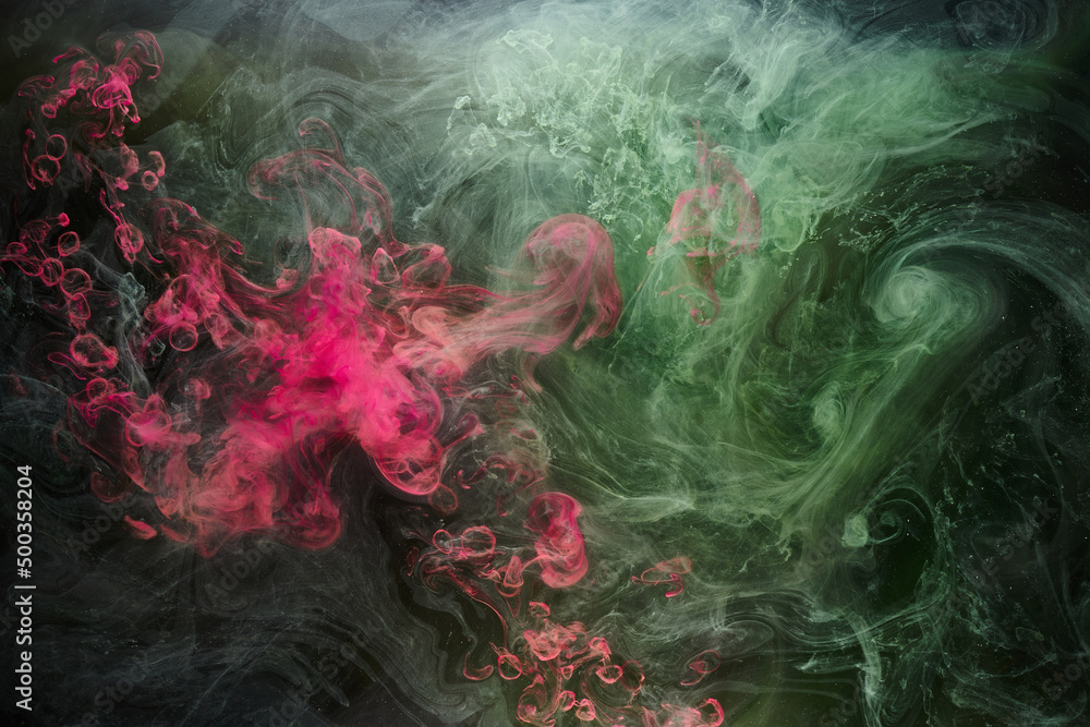 Green pink smoke on black ink background, colorful fog, abstract swirling touch ocean sea, acrylic paint pigment underwater