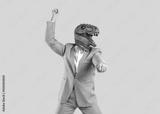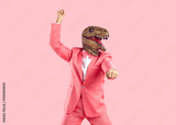 Funny confident man wearing rubber dinosaur mask dancing at show or event. Happy crazy T Rex guy in funky pink party suit with bow tie doing gangnam style moves isolated on pink colour background