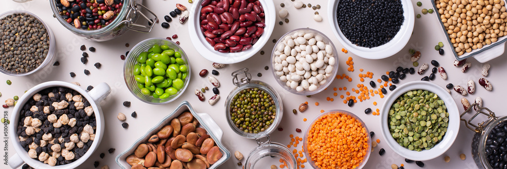 Variety of legumes, lentils, beans, plant based vegan protein source