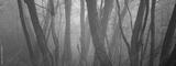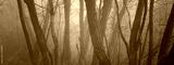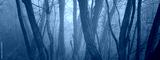 Mystical panoramic wide dark foggy forest view in cold autumn tones. Halloween background.