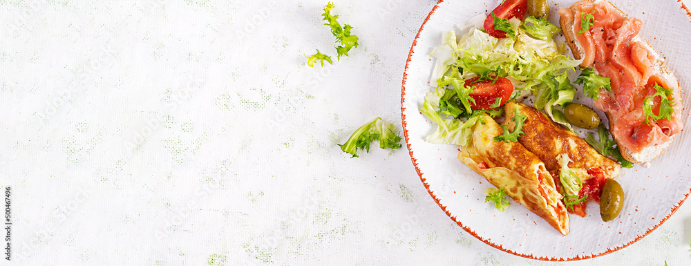 Breakfast. Omelette roll with tomatoes and sandwich with salmon on white plate. Lunch. Top view, banner