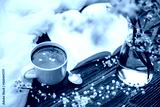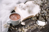 Cup of hot chocolate cacao, old book and spring cherry flowers on wooden background. Reading concept