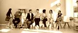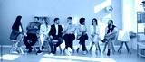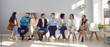 Narrow wide shot of diverse employees sit on chairs in row brainstorm or discuss ideas. Banner of smiling multiethnic candidate in line before office meeting or interview. Employment concept.
