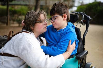 Disabled boy in a wheelchair and his mother enjoying a day together outdoors in a park.