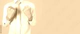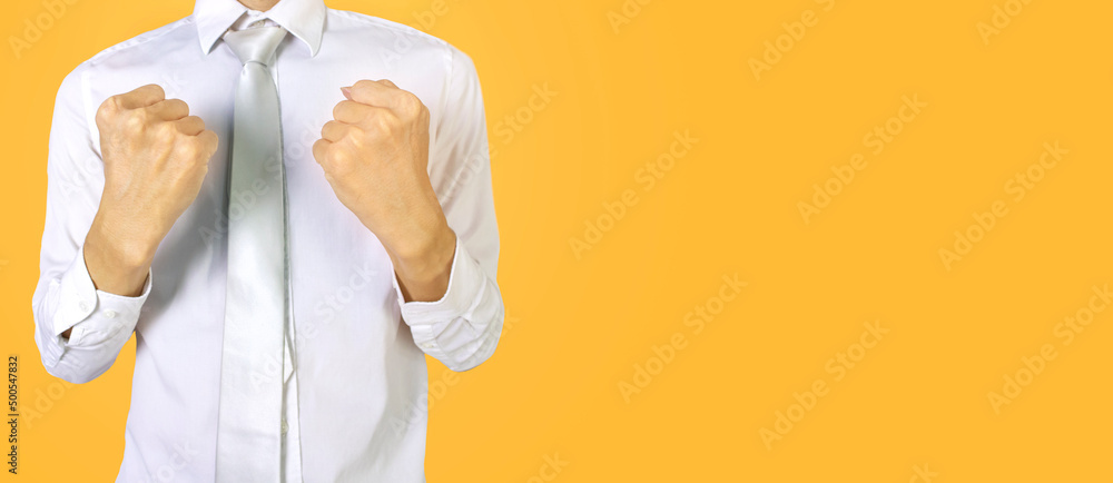 business man in white work clothes on a yellow background,clenched fists to encourage work