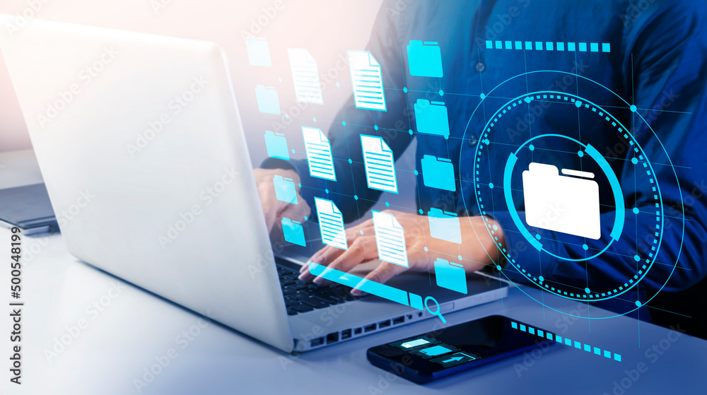 Businessman look up documents and sort items for efficiency. ,Systematic search document information concept. ,Search and verify business data