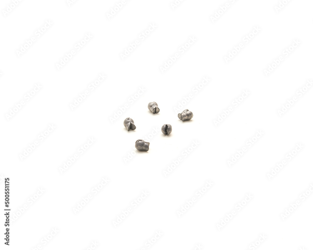 Five split-shot sinkers removable and reusable shot weights isolated on white background