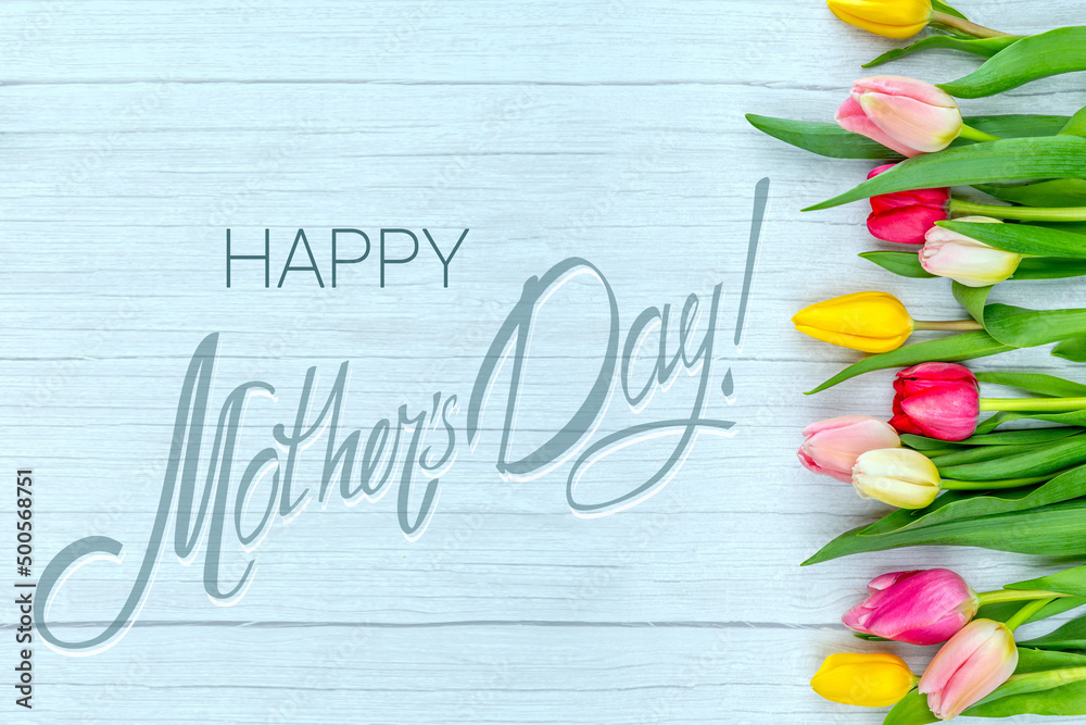 Happy Mother's Day greeting card with a congratulatory calligraphic inscription on a bright floral background. A photo of flowers with lettering ready-made for congratulating your mom