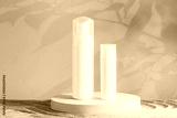 Two white blank plastic packaging cosmetic pump bottles for mousse foam cream and lotion stand on round podium, beach sand and beige background. Front view