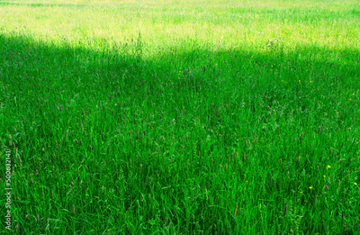 field with green grass and spring flowers