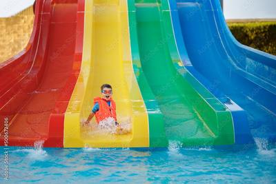 happy little boy on water slide at aquapark