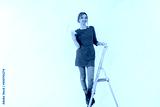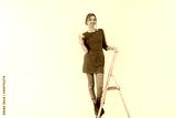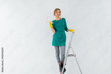 A young girl is engaged in repairs on the stairs and paints a white wall with a roller in a new apartment. Renovation of the interior and a new apartment. Housewarming and a desirable mortgage.
