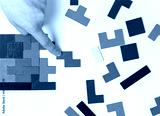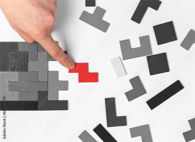 Hand putting outstanding tetris puzzle piece. Logical thinking, problem solving concept. Important missing element adding. Uniqueness, standing out from crowd, individuality concept. photo