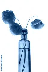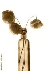 Three large red poppy flowers with long stems in a yellow transparent glass bottle with water on a white paper background
