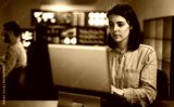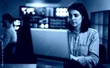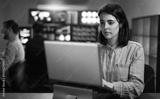 Young caucasian woman working in the office using laptop. Financial analyst, trader and stock market.