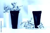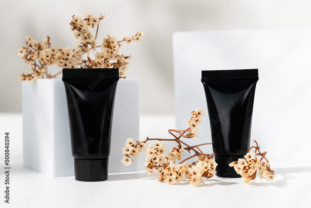 Black Bottle tube with ingredients for skin care and treatment vitamin on white background, Natural cosmetics concept.