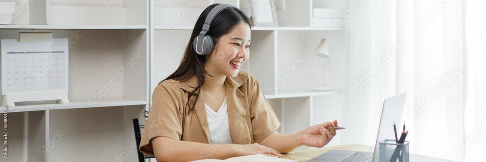 Online lifestyle concept A female worker reading information on the laptop and taking note on the paper.