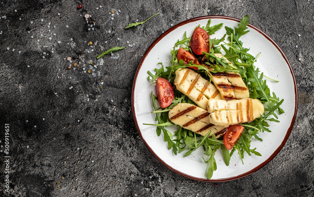 halloumi cheese salad with arugula and tomatoes. ketogenic paleo diet. Delicious breakfast or snack, Clean eating, dieting, vegan food concept. top view
