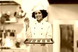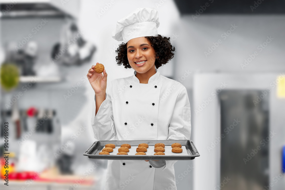 cooking, culinary and bakery concept - happy smiling female chef or baker in white toque and jacket holding baking tray with oatmeal cookies over restaurant kitchen background