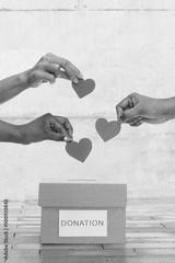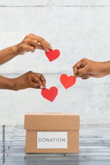 charity, love and valentine's day concept - close up of hands putting red hearts into donation box over urban steet background