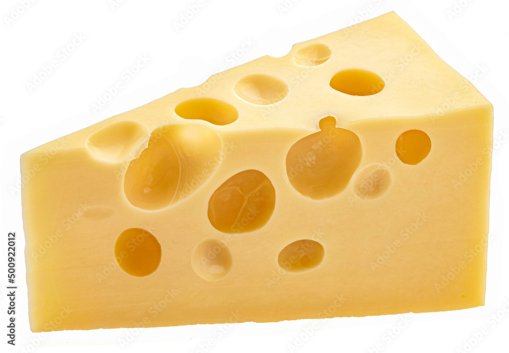 Swiss cheese triangle isolated on white background, full depth of field
