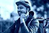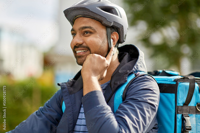 food shipping, technology and people concept - happy smiling delivery man in bicycle helmet with thermal insulated bag and earphones listening to music on city street