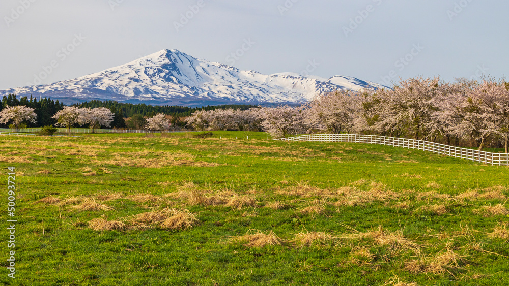 牧場の桜と鳥海山