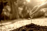 man hand watering a sapling growing in germination sequence on fertile soil, seed and planting concept with Male hand watering young tree over green background