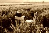 Dream writer's workplace in green wheat field surrounded by hills at sunset. Retro typewriter with blank paper sheet on white vintage table with wooden chair. Creative freedom and remote work concept
