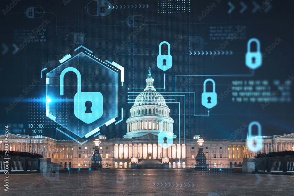 Front view, Capitol dome building at night, Washington DC, USA. Illuminated Home of Congress and Capitol Hill. The concept of cyber security to protect confidential information, padlock hologram