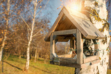 Homemade wooden birdhouse fixed on birch tree trunk at autumn garden