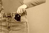 Cropped close up woman 20s wear casual orange short hold in hand put credit bank card to denim pocket isolated on plain pastel light green color background studio portrait. People lifestyle concept.
