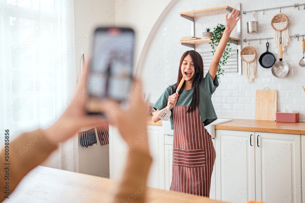 Hand of female with smartphone shooting happy asian woman dancing at home when making video for social media, Stories and vlog concept.