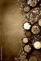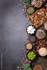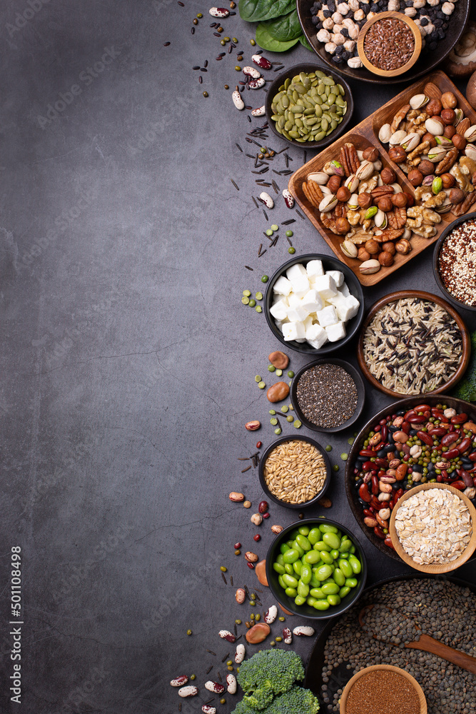 Variety of vegan, plant based protein food, legumes, lentils, beans