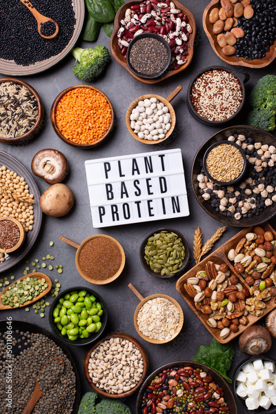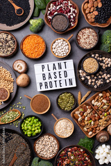 Variety of vegan, plant based protein food, legumes, lentils, beans