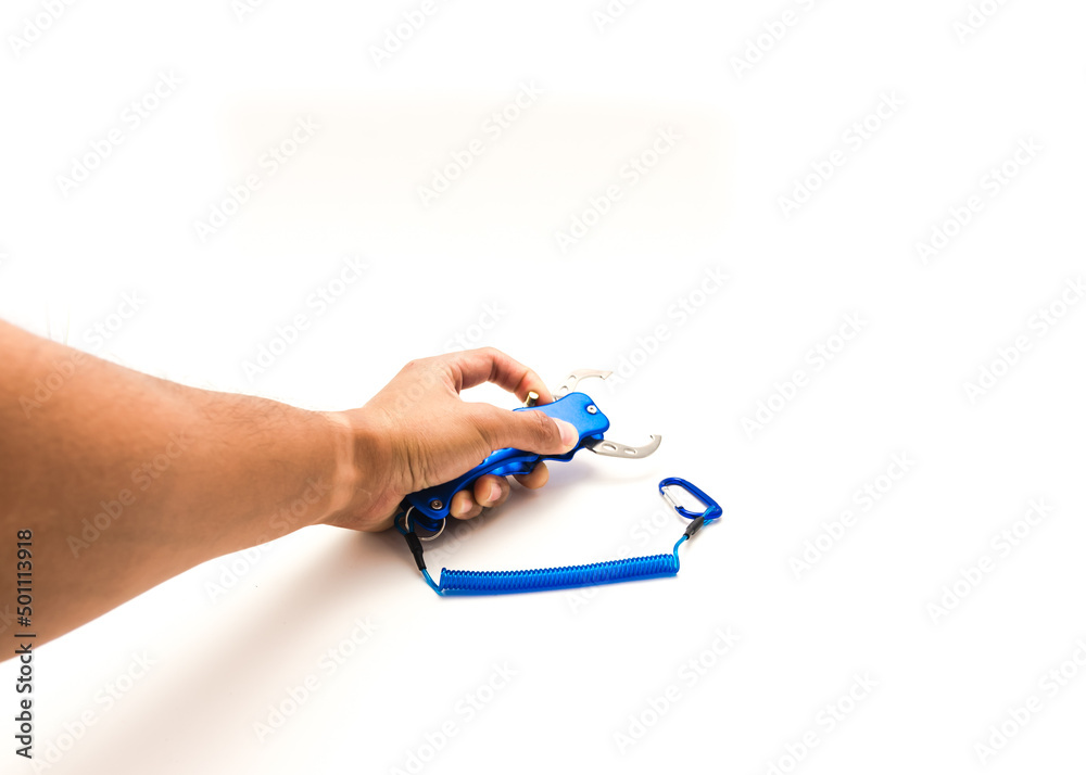 Asian man hand holding a blue fish lip gripper in open position with coiled lanyard retainer isolated on white background