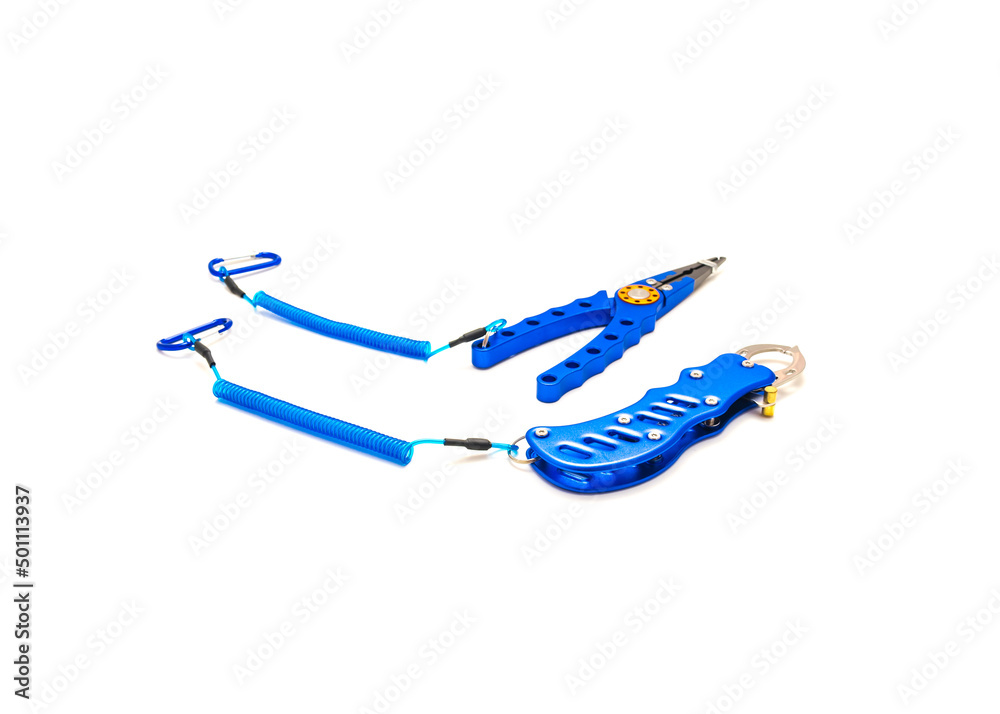 Collection of aluminum alloy fish lip gripper and fishing pliers with coiled lanyard retainer isolated on white background