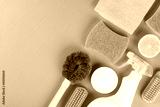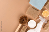 Organic household cleaners for green household - bamboo brush, organic dishcloth, lemon, baking soda, citric acid, spray bottle on beige background with copy space. Mockup, flat lay