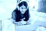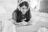 Happy woman relaxing while wearing headphones watching videos on laptop lying on a bed at home, Chill out and leisure concept