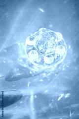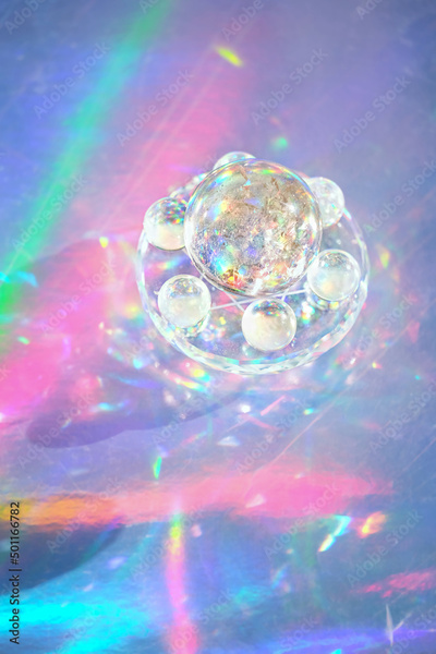 quartz crystal balls on holographic background. ball Refracting vivid rainbow colors light. Magic spiritual healing crystal practice, Protect from negative energy, uplifting positive spirit, harmony