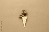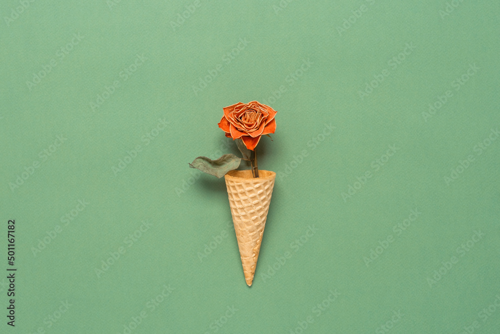 Dried rose in a waffle cone on a green pastel background. Top view, flat lay. Creative layout.