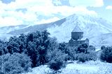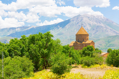 Amazing spring view of Armenian Church of the Holy Cross on Akdamar Island (Akdamar Adasi), Lake Van/Turkey. Surrounded by tree in blossom, in a middle of Akdamar Island.