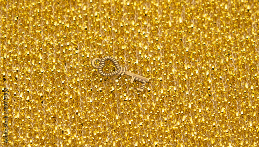 Bronze ornamental key with unique shapes and design on golden metal shavings background