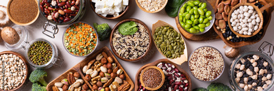 Variety of vegan, plant based protein food, legumes, lentils, beans