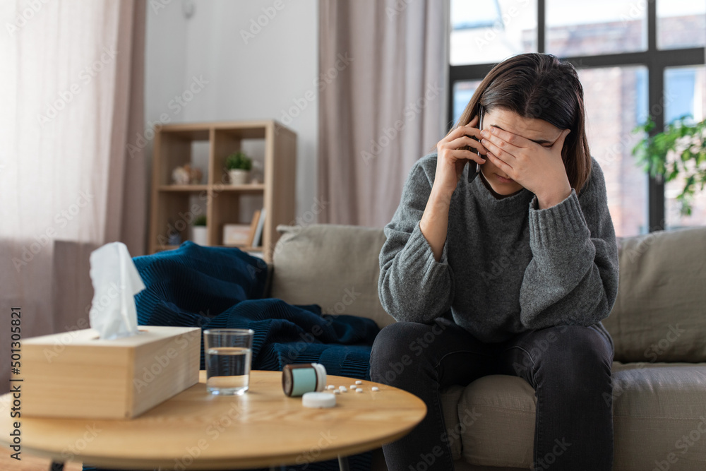 mental health, psychological help and depression concept - stressed woman with sedative medicine on table calling on phone at home