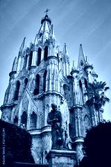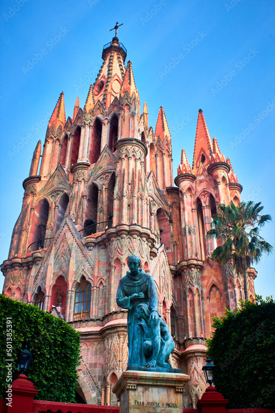 parroquia color rosa con estilo neogótico y un cielo azul con estatua de un monje en frente en san miguel de allende guanajuato